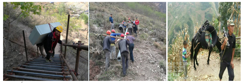 “悬崖村”海拔1600米,从山底到山顶的海拔相差近1000米,与地面垂直距离约800米,出行主要依靠17 条、218级、长约4公里的藤梯。严峻的自然环境,网络建设任务异常艰巨,凉山移动攻坚克难,人背马驮搬运3280公斤抱杆、325公斤光缆、20吨基站物料到建设地点。2016年11月20日,凉山移动率先在“悬崖村”开通4g基站;2017年4月19日,开通光纤宽带网络。