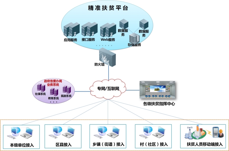 精准扶贫大数据平台支持云部署架构,平台建设模式采用统一部署,分散接入。移动终端通过3g/4g网络接入互联网实现与精准扶贫大数据平台数据交互。外部数据通过防火墙等安全设备后接入精准扶贫平台。组网结构示意图如下: