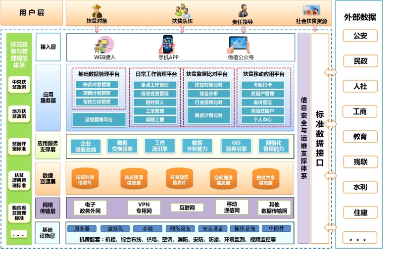 扶贫工作经过多年的努力,取得了巨大的成绩,但仍然存在一些管理效率相对较低,业务操作不规范等问题。而信息化是推动管理精细化,业务流程化和服务规范化的一个重要手段,为提高扶贫工作效率和管理水平,降低扶贫信息传递和沟通成本,建设精准扶贫大数据平台。根据国家、地方关于精准扶贫的相关政策和领导指示精神要求: