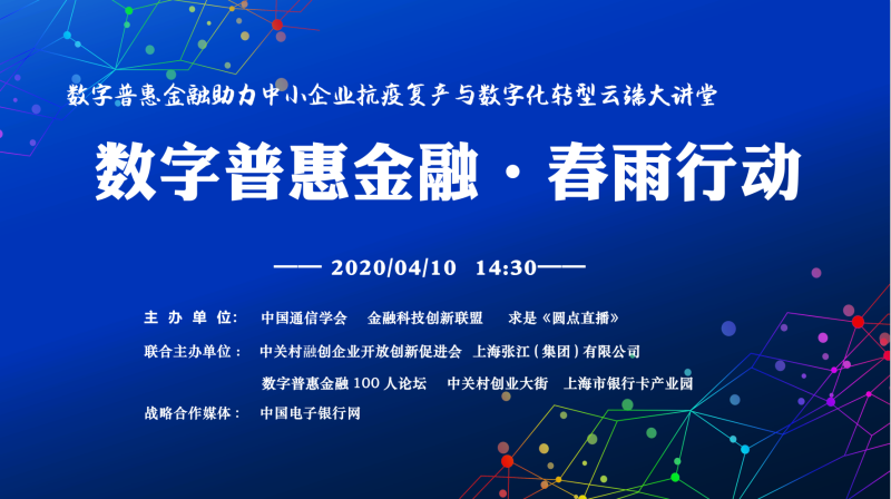 4月10日下午,中国通信学会、金融科技创新联盟、求是《圆点直播》、中关村融创企业开放创新促进会、上海张江(集团)有限公司、上海市银行卡产业园等相关主办单位将共同线上宣布“数字普惠金融·春雨行动”正式启动,并举办第一场数字普惠金融云端大讲堂活动。中国信息通信研究院副总工程师陈金桥、中国人民大学金融科技与互联网安全研究中心主任、教授杨东将从学术角度分享5g如何引领数字新应用、数字普惠金融如何在抗疫中发挥积极作用;中国建设银行普惠金融部总经理张为忠、中国工商银行网络融资中心副总经理郑昕、浦发银行信息科技部副总经理万化将分享金融机构数字普惠如何助力小微企业抗疫复产和数字化转型;科技企业代表百度智能云副总经理李硕将分享百度人工智能如何通过线上方式助力企业抗疫复产。