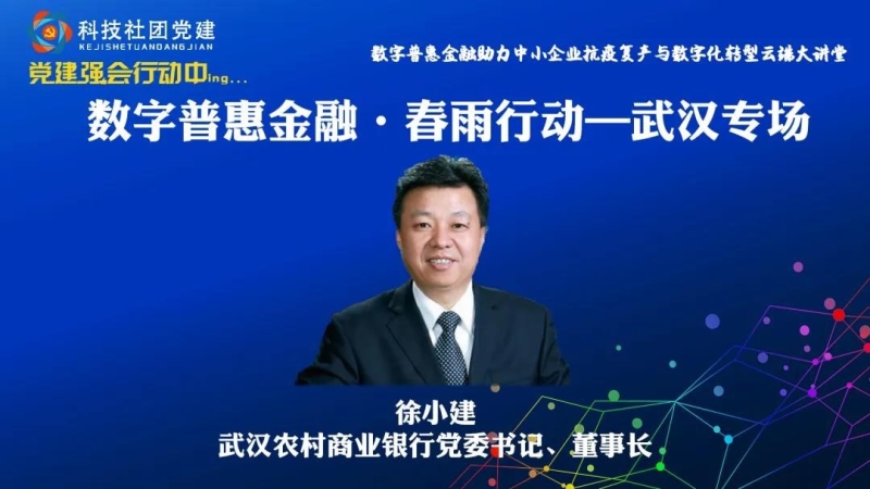 武汉农村商业银行党委书记、董事长徐小建发表了题为《责任担当 同心战“疫”——武汉农村商业银行数字普惠助力抗疫和复工复产》的主题演讲。徐小建表示武汉农商行坚持普惠金融战略不动摇,积极探索“特色化”发展道路,主要是做到四个“进一步”:进一步发挥金融支农主力军的作用,打通普惠金融服务的最后一公里;进一步加强中小微企业服务质效,持续对全市经济的毛细血管输血造血;进一步探索金融扶贫新模式,不断延伸金融服务触角;进一步扩大金融服务辐射区域,深度延伸村级服务渠道,为促进城乡经济服务均衡化发展起到了积极促进的作用。徐小建表示武汉农商行坚持发挥资源禀赋优势,全力以赴助力中小企业抗疫复产,在“普”及扩面、“惠”及企业、用“芯”服务三条战线上全面发力。在“普”字上做文章,大力推动金融服务扩面增量;在“惠”字上下功夫,深入挖掘降费让利空间;在“芯”字上见真章,全面强化资源整合能力。徐小建表示武汉农商行坚持科技创新引领,全力打造数字普惠地方金融新样本。金融科技正在快速成为普惠金融创新的重要驱动力,在疫情最严重的湖北武汉,这种发展趋势显得更为突出和紧迫,也为地方金融机构数字化转型提供了历史性的发展机遇,在这场数字经济的历史洪流中,不仅要找出新形势下适合发展的新路径、新构思,还要考虑转型后的延续性和协调性,通过传承和保留现有机制中符合区域普惠发展的各种要素,走出一条符合自身实际、具有鲜明特色的数字普惠创新之路。