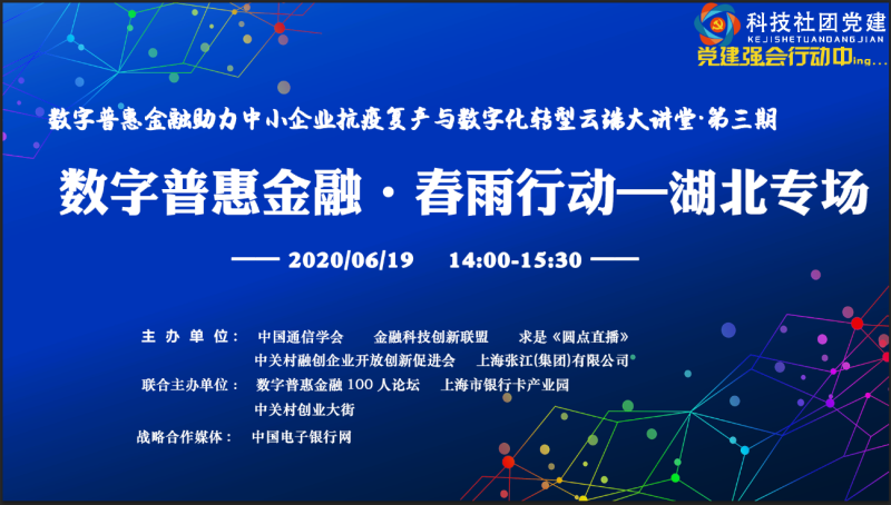 为贯彻落实习近平总书记关于“发挥行业协会、商会等组织的作用,指导和帮助企业等会员单位科学精准防疫、有序复工复产”的重要指示精神,在中国通信学会党支部的领导下,2020年6月19日,由中国通信学会、金融科技创新联盟、求是《圆点直播》、数字普惠金融100人论坛、中关村融创企业开放创新促进会、上海张江(集团)有限公司、上海银行卡产业园等单位联合主办的数字普惠金融助力中小企业抗疫复产与数字化转型特别行动计划“春雨行动”启动会暨“数字普惠金融助力中小企业抗疫复产与数字化转型”云端大讲堂第三期——武汉专场正式开讲,直播观看人数达到14.6万人次。