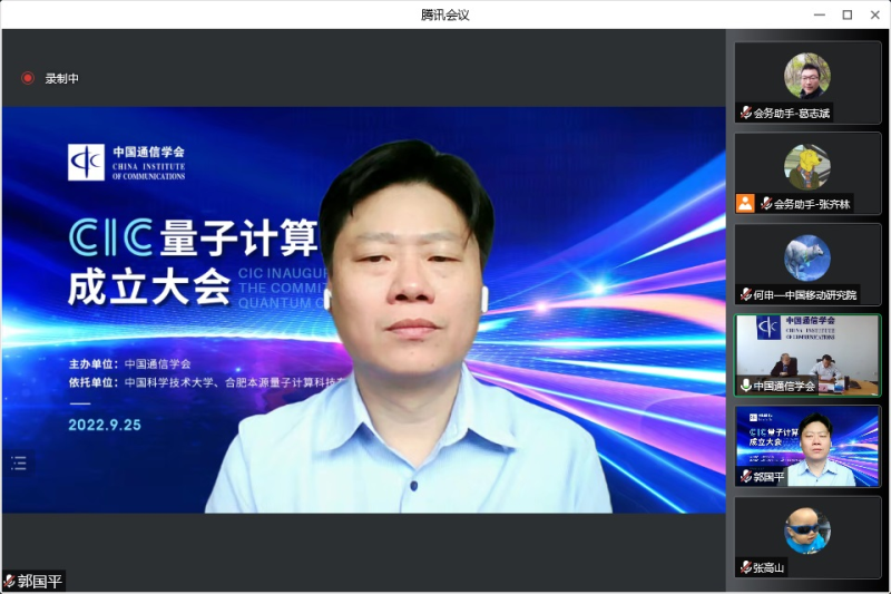 2022年9月25日,中国通信学会量子计算委员会成立大会在线上成功召开。中科院量子信息重点实验室主任、中国科学院院士郭光灿教授致辞,中国通信学会副理事长兼秘书长张延川出席并讲话,副秘书长文剑主持成立大会。