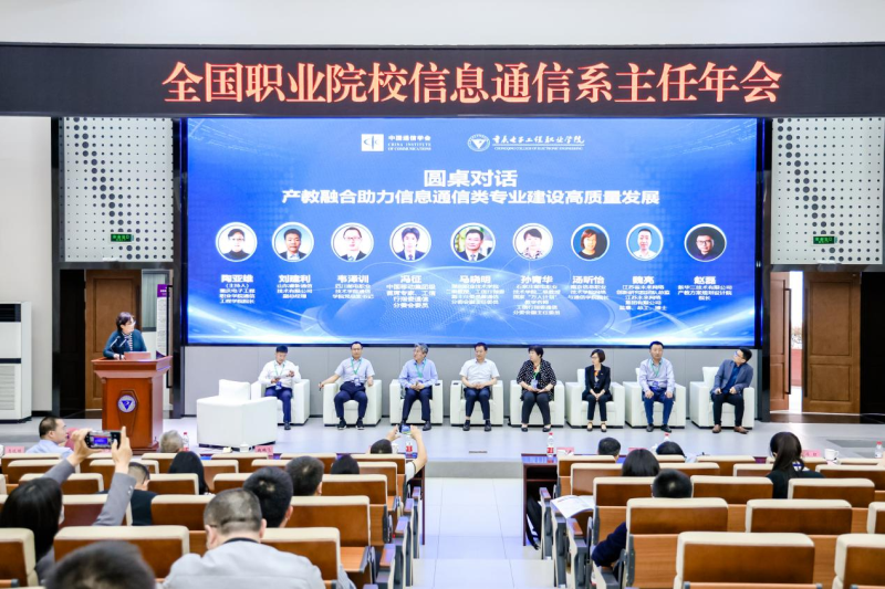 圆桌对话环节,深圳职业技术学院二级教授、工信行指委副主任委员兼通信分委会副主任委员马晓明,石家庄邮电职业技术学院二级教授、国家“万人计划”教学名师、工信行指委通信分委会副主任委员孙青华,南京信息职业技术学院网络与通信学院院长汤昕怡、四川邮电职业技术学院通信学院党总支书记韦泽训,中国移动集团级首席专家、工信行指委通信分委会委员冯征,江苏省未来网络创新研究院团队总监魏亮,新华三技术有限公司产教方案规划设计院院长 赵磊、山东睿新通信技术股份有限公司副总经理刘建利围绕“产教融合助力信息通信类专业建设高质量发展”展开对话,本环节由重庆电子工程职业学院通信工程学院院长陶亚雄主持。