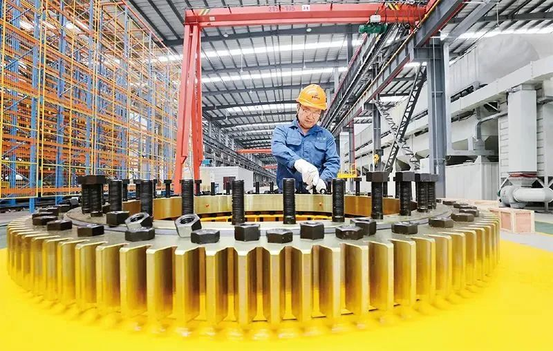 建设现代化产业体系,必须推动数字经济和实体经济深度融合。图为2023年7月4日,浙江省湖州市德清县雷甸镇一家工程机械公司的智能工厂内,工人在赶制塔机回转机构。人民图片 谢尚国/摄