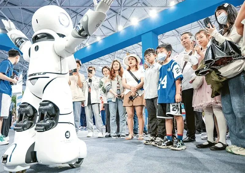 5月26日,2023中国国际大数据产业博览会在贵州省贵阳市开幕。图为参观者在博览会展馆内与智能机器人互动。人民图片 何晓璇/摄