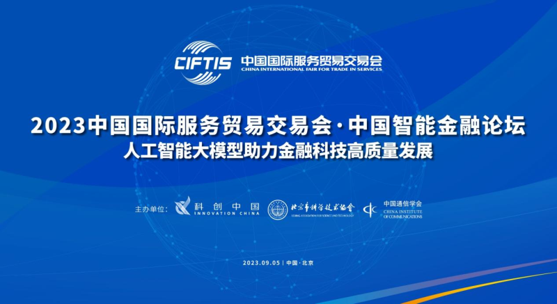 2023年9月5日, 由北京市科学技术协会、中国通信学会、“科创中国”金融科技产业服务团、“科创中国”京津冀挂点工作组共同主办的“2023年中国国际服务贸易交易会·中国智能金融论坛”在国家会议中心成功召开。来自政府主管部门、行业协会、金融机构、科技企业、研究机构和国际标准组织的嘉宾300余人出席论坛。会议围绕人工智能大模型这一当今全球热门技术,探讨了人工智能大模型在我国金融领域的应用创新成果和全球智能金融未来发展方向。