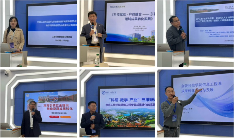 东软教育科技集团董本清作《科技赋能・产教融合——东软教育信息通信领域成果转化实践》报告;广州轻工业职业技术大学陈岗作《以“三教”改革为引擎,驱动ict人才培养与产业服务双轮并进》报告;福建信息职业技术学院张智群作《双高引领五金建设,推动资源成果转化》报告;南京工程学院杨伟博作《科研-教学-产业”三维联动:南京工程学院通信工程专业成果转化的实践与探索》报告;金陵科技学院牛犇作《金陵科技学院信息工程系成果转化实践与发展》报告。